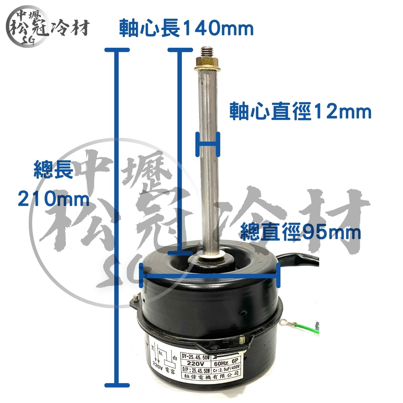 室外機風扇馬達50W 產品規格 ●應用:普遍應用於定頻室外機 ●O/P:25.45.50W ●電壓:220V ●頻率:60HZ ●轉速:6P ●Cr:2.5μf/450V ●尺寸:軸心長140mm/軸心直徑12mm 總長210mm/總直徑95mm