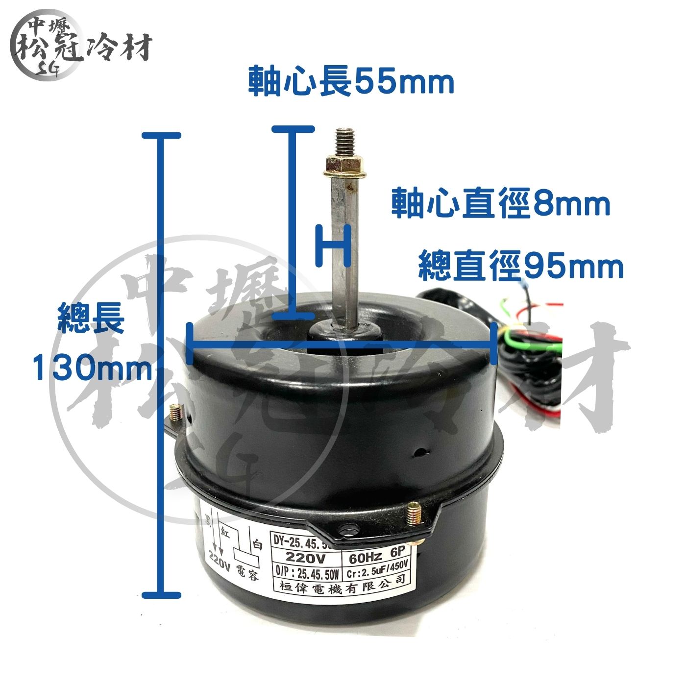 室外機風扇馬達50W 產品規格 ●應用:普遍應用於定頻室外機 ●O/P:25.45.50W ●電壓:220V ●頻率:60HZ ●轉速:6P ●Cr:2.5μf/450V ●尺寸:軸心長55mm/軸心直徑8mm 總長130mm/總直徑95mm