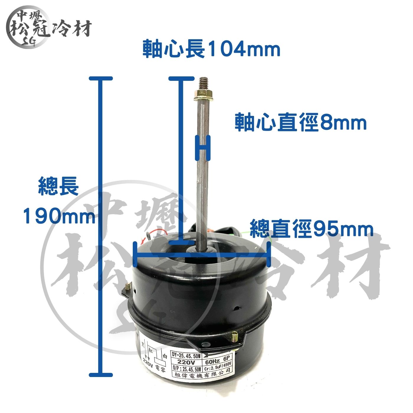 室外機風扇馬達50W 產品規格 ●應用:普遍應用於定頻室外機 ●O/P:25.45.50W ●電壓:220V ●頻率:60HZ ●轉速:6P ●Cr:2.5μf/450V ●尺寸:軸心長104mm/軸心直徑8mm 總長190mm/總直徑95mm