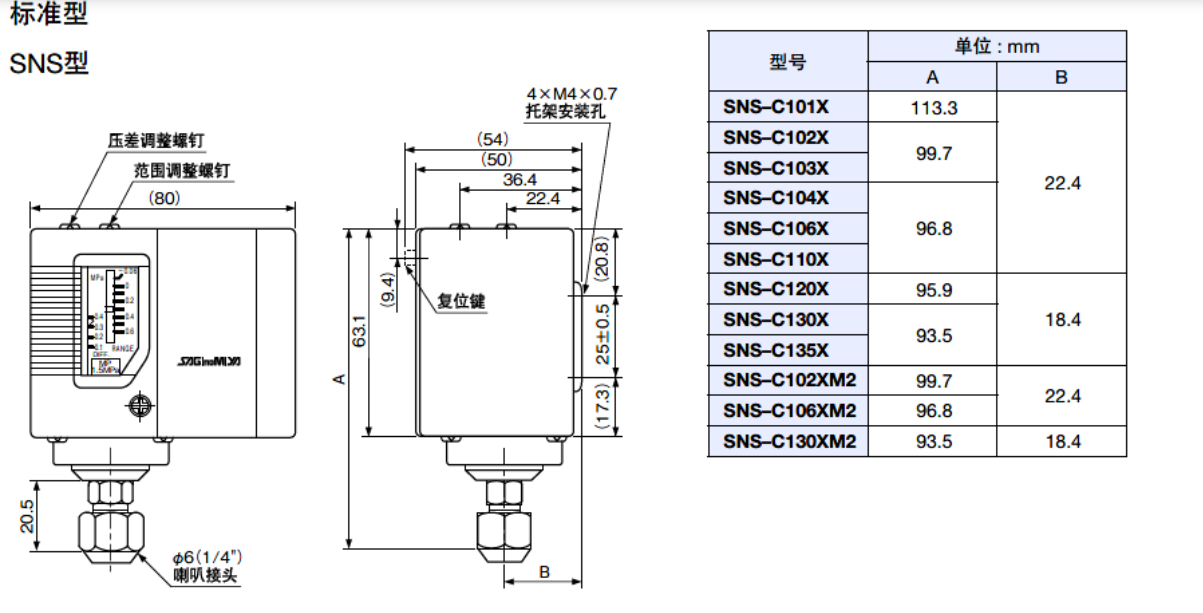 ●SNS標準型壓力開關為"通用型"壓力控制器