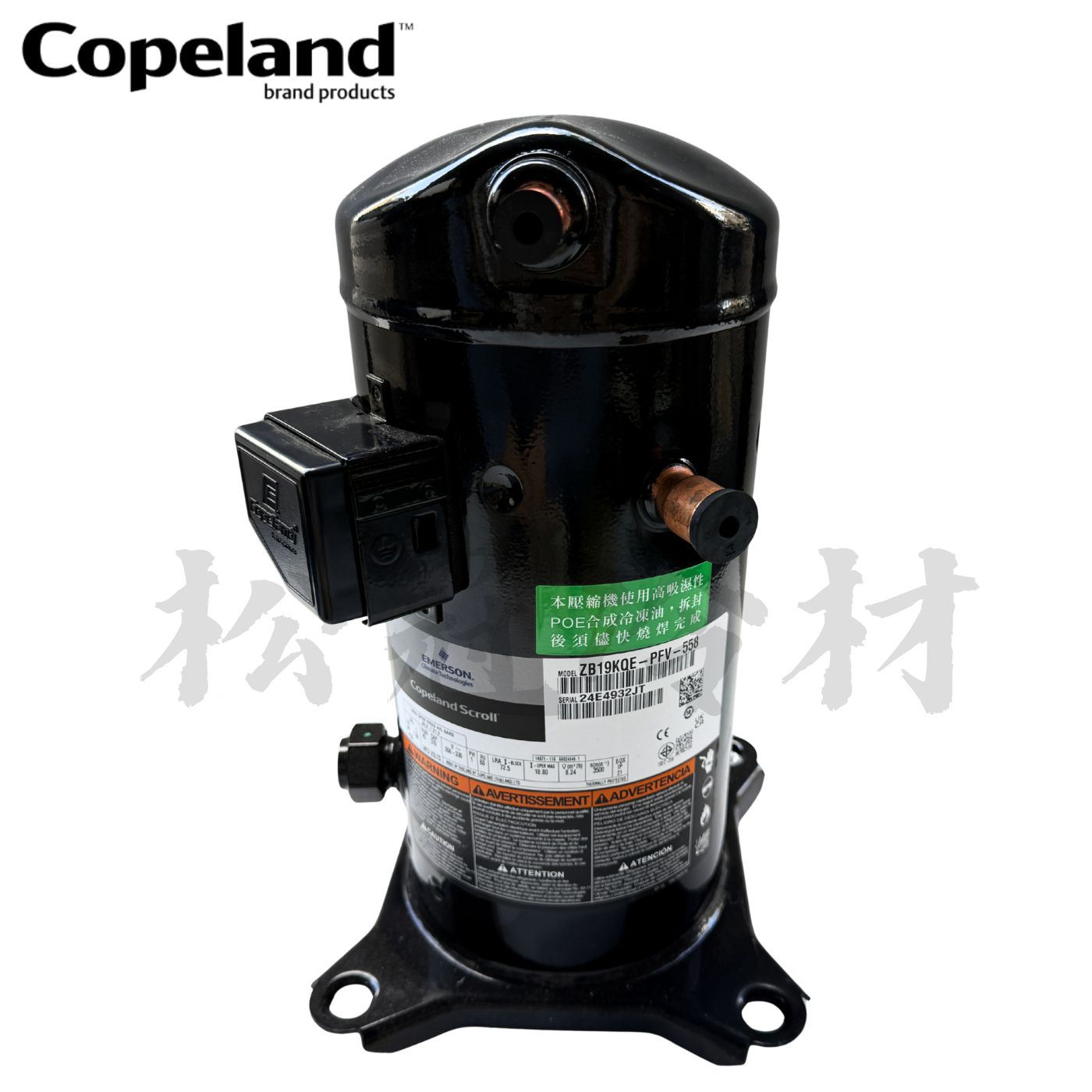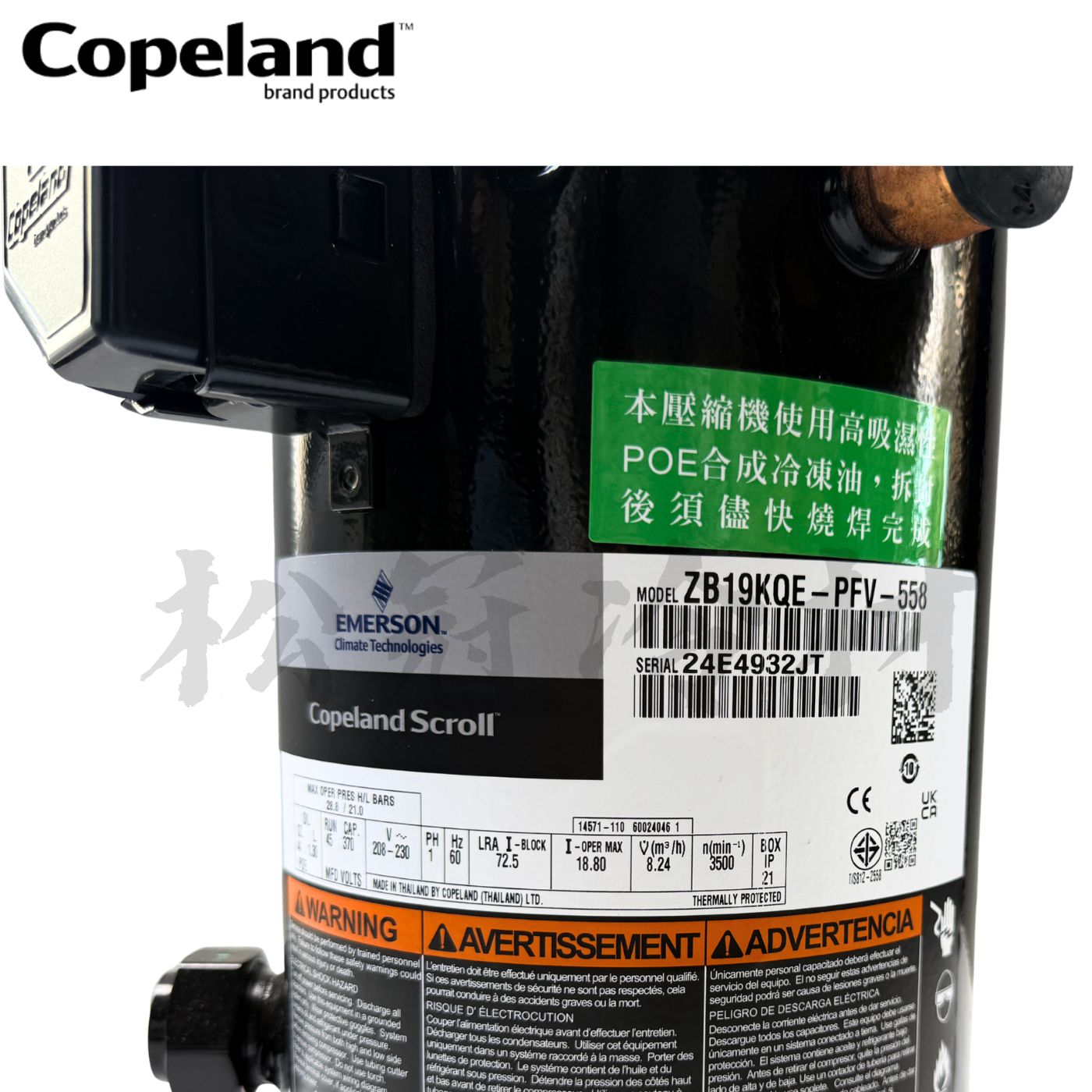 黑金剛 Copeland ZB19KQE-PFV-558 產品規格 ●冷媒:R404A ●應用範圍:中/低溫 ●電壓:208~230V/60Hz ●馬力:2 1/2 HP ●單相 ●排氣量:39.3 ●電容:45uf/ 440Vac