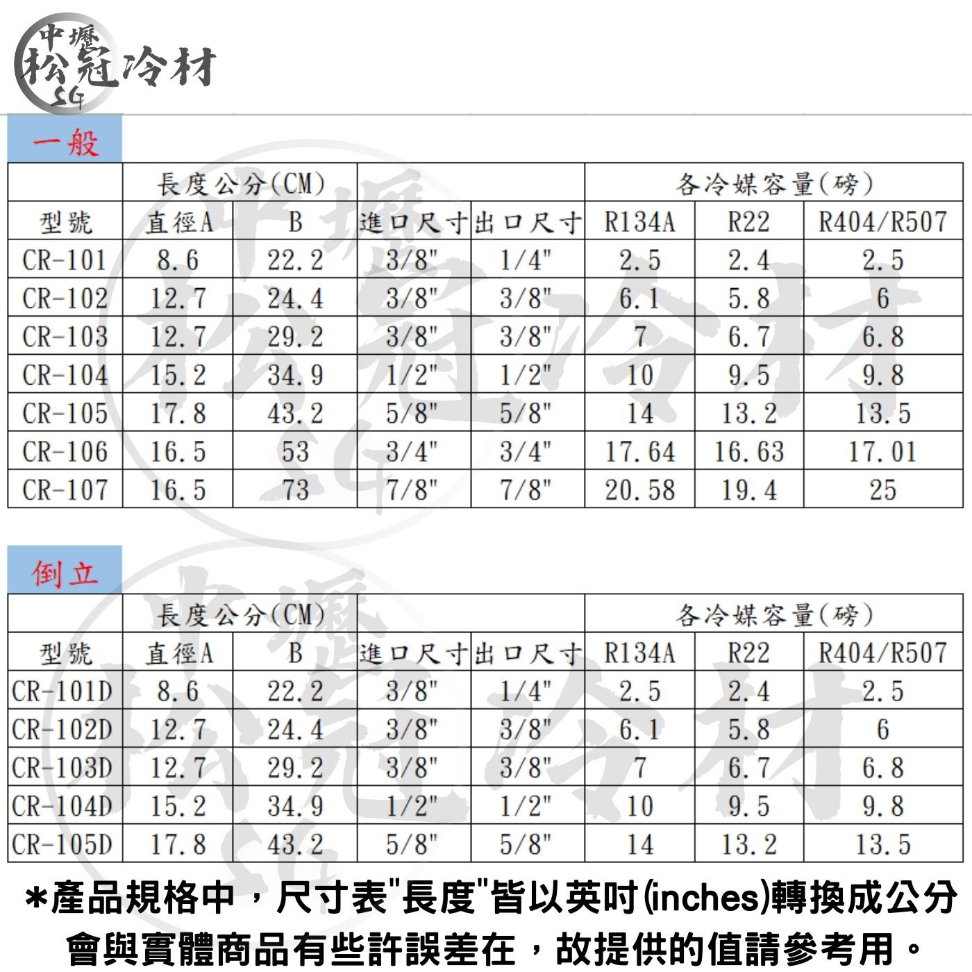 Shin Time 高壓儲液器總攬表(Refrigerant receiver) 產品介紹 ●產品需垂直安裝 ●每個尺寸皆有朝上出口及朝下出口。 (通常會以朝上出口為訂購) ●提供450 PSIG安全工作壓力 產品規格 桃園中壢松冠冷氣冷凍材料批發零售,如有相關材料問題,歡迎來電詢問!