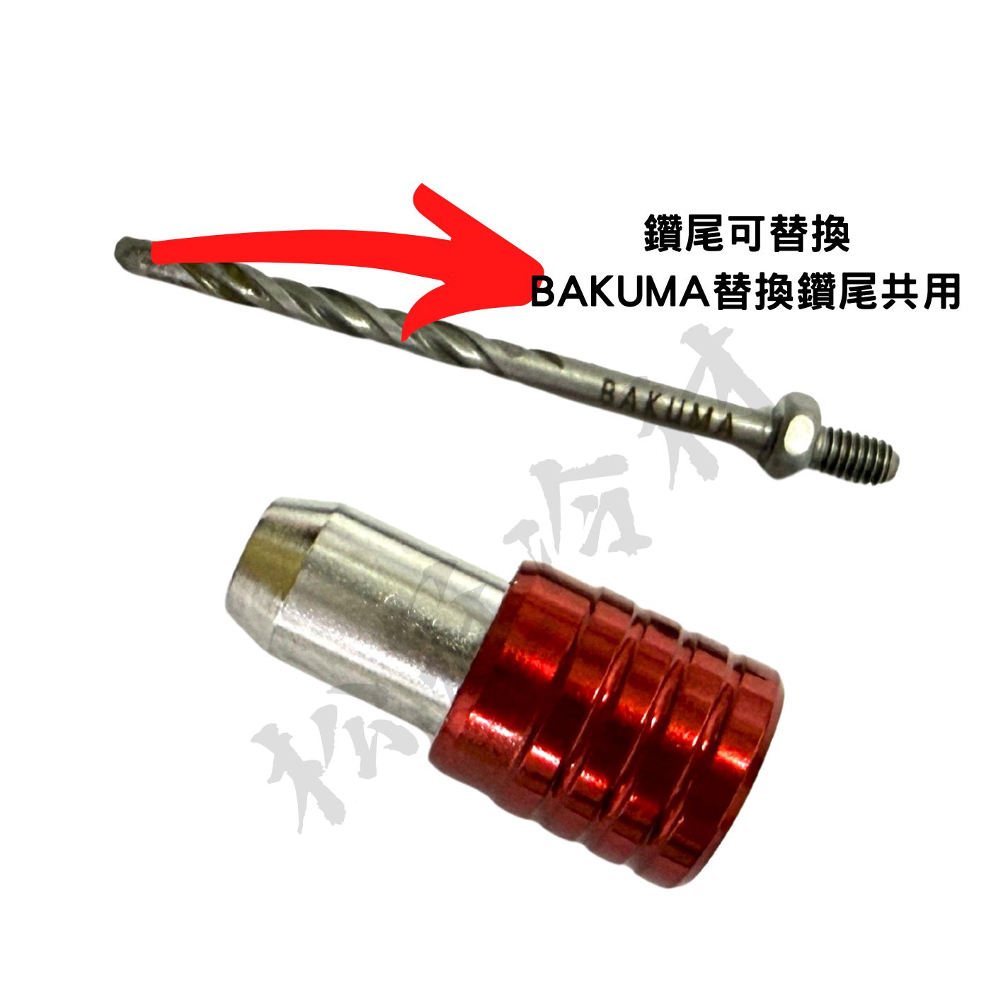 雙向快脫鑽尾(1/8" ) 產品介紹 ●水泥鑽頭(鑽兼鎖) ●快拆雙向式設計,迅速穩定 傳統式會將套筒裝在十字頭上,容易經由震動將鑽尾噴飛或者鑽尾方向偏開 ●雙滑珠設計,以便扣住起子頭(如圖片三),鑽孔不易打滑 ●可替換鑽尾採用BAKUMA鑽尾(BB-110),超耐用 ●台灣製造