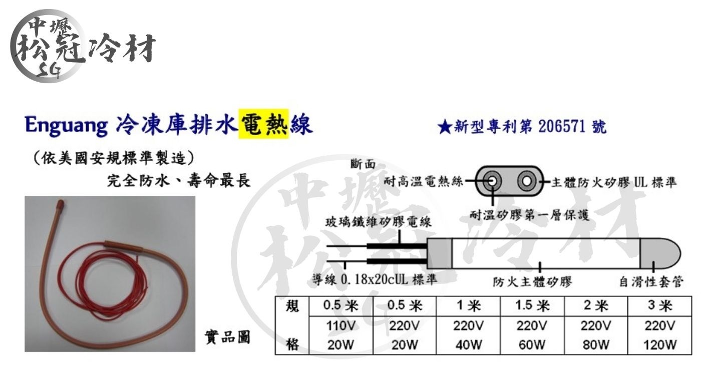 Engunag 冷凍庫排水電熱線 產品介紹 ●依美國UL安規標準製造 ●日本進口矽膠 ●完全防水,防火,防漏電 ●業界最長壽命 ●規格 0.5米*110V 20W 0.5米*220V 20W 1米*220V 40W 1.5米*220V 60W 2米*220V 80W 3米*220V 120W